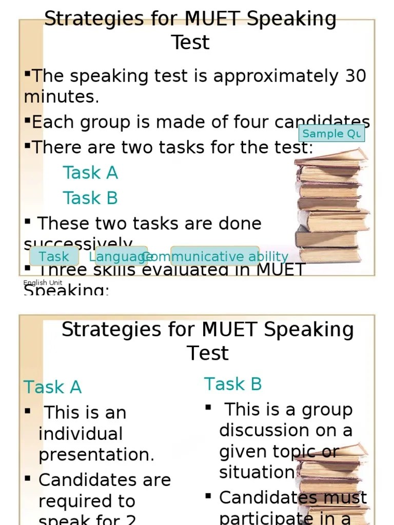 To be an active participant in task b could be a real challenge to some of us. You have to listen only. Task a candidate a a very good morning to one and all. Yes i would, thank you, candidate c. Muet speaking example 2 :